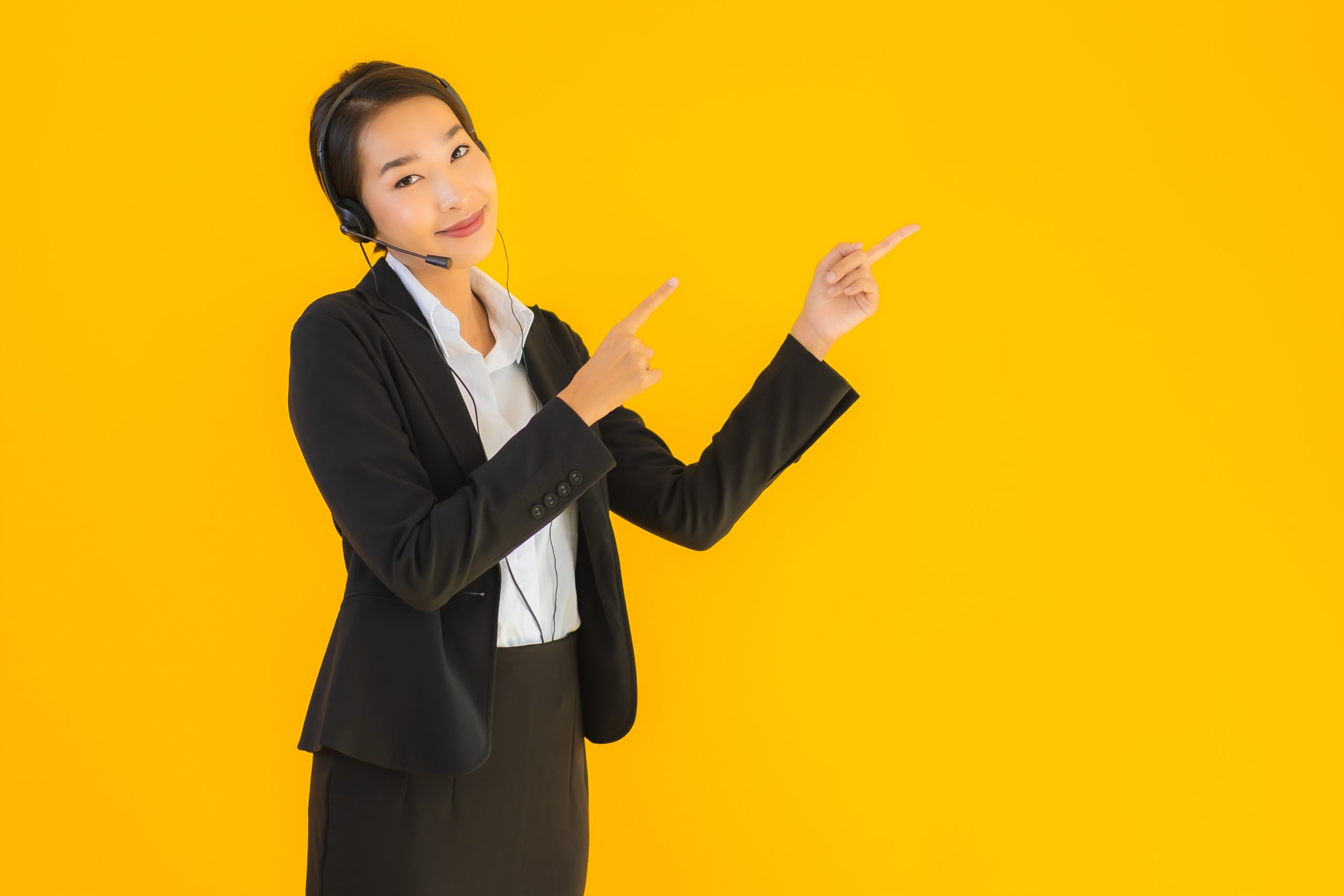 Portrait beautiful young business asian woman with headphone or headset for call center or telemarketing on yellow isolated background